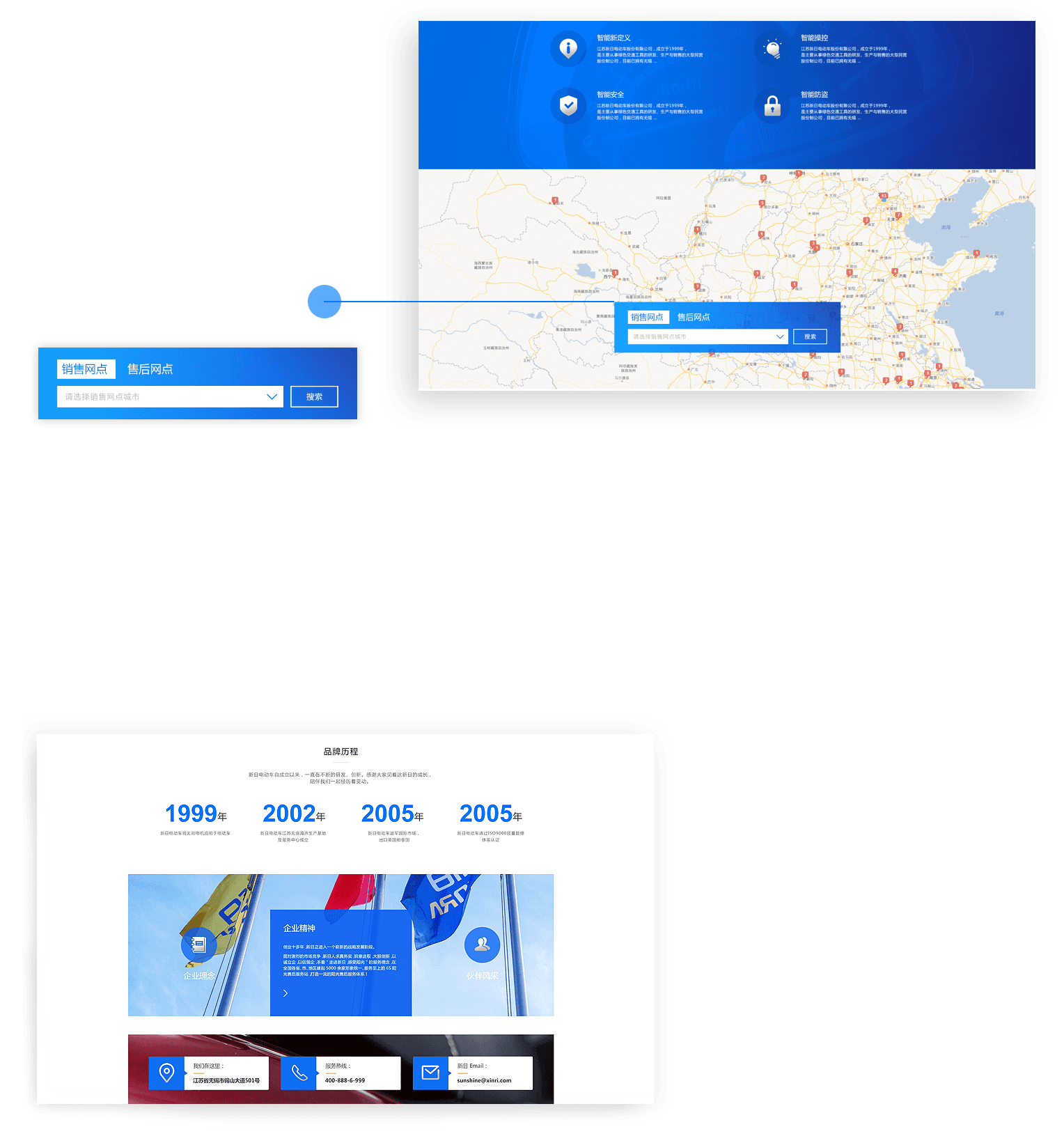 新日電動(dòng)車官網(wǎng)調(diào)取百度地圖實(shí)時(shí)數(shù)據(jù),通過標(biāo)簽定位的方式,實(shí)現(xiàn)銷售網(wǎng)點(diǎn)、售后網(wǎng)點(diǎn)的查詢,極大的方便了用戶,提升了服務(wù)質(zhì)量和銷售渠道。