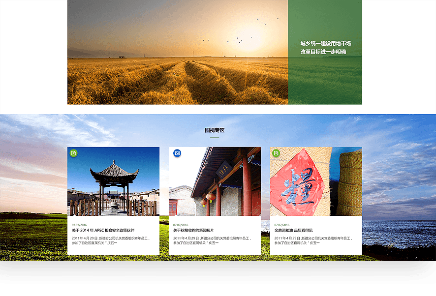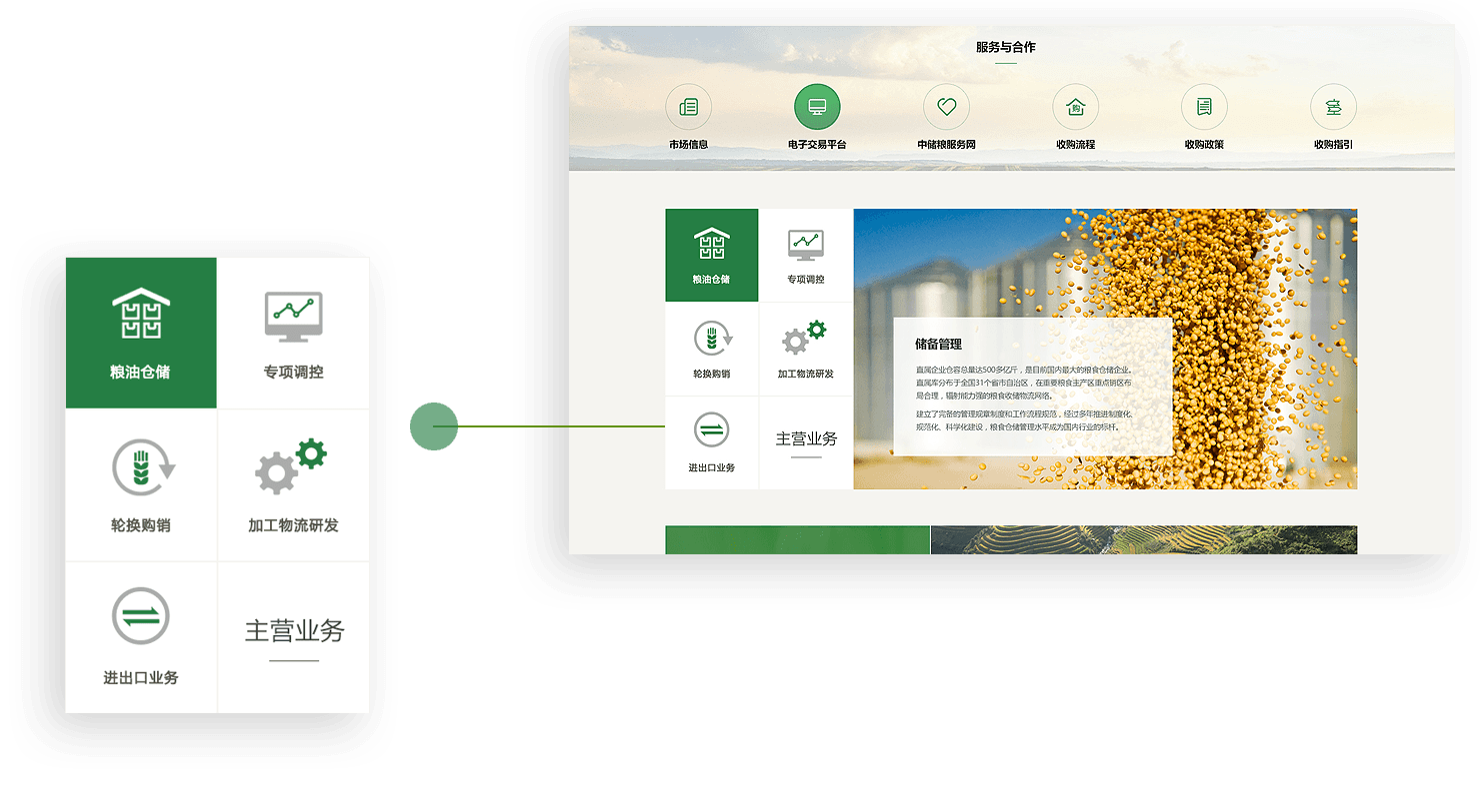 中儲(chǔ)糧官網(wǎng)采用扁平化ICON的方式,集中展示儲(chǔ)備管理、輪換購(gòu)銷、專項(xiàng)調(diào)控等多元業(yè)務(wù),在保證用戶便于閱讀的基礎(chǔ)上,通過(guò)創(chuàng)意、交互吸引用戶關(guān)注。