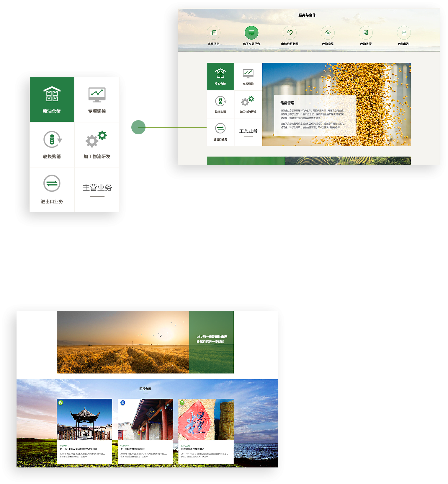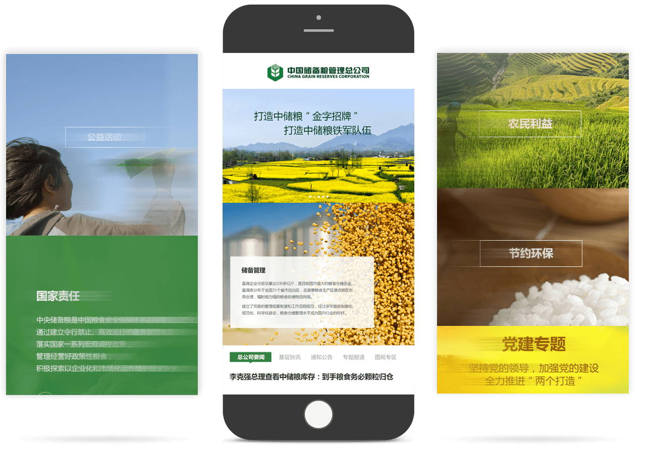 中儲(chǔ)糧官網(wǎng)采用扁平化ICON的方式,集中展示儲(chǔ)備管理、輪換購(gòu)銷、專項(xiàng)調(diào)控等多元業(yè)務(wù),在保證用戶便于閱讀的基礎(chǔ)上,通過(guò)創(chuàng)意、交互吸引用戶關(guān)注。
