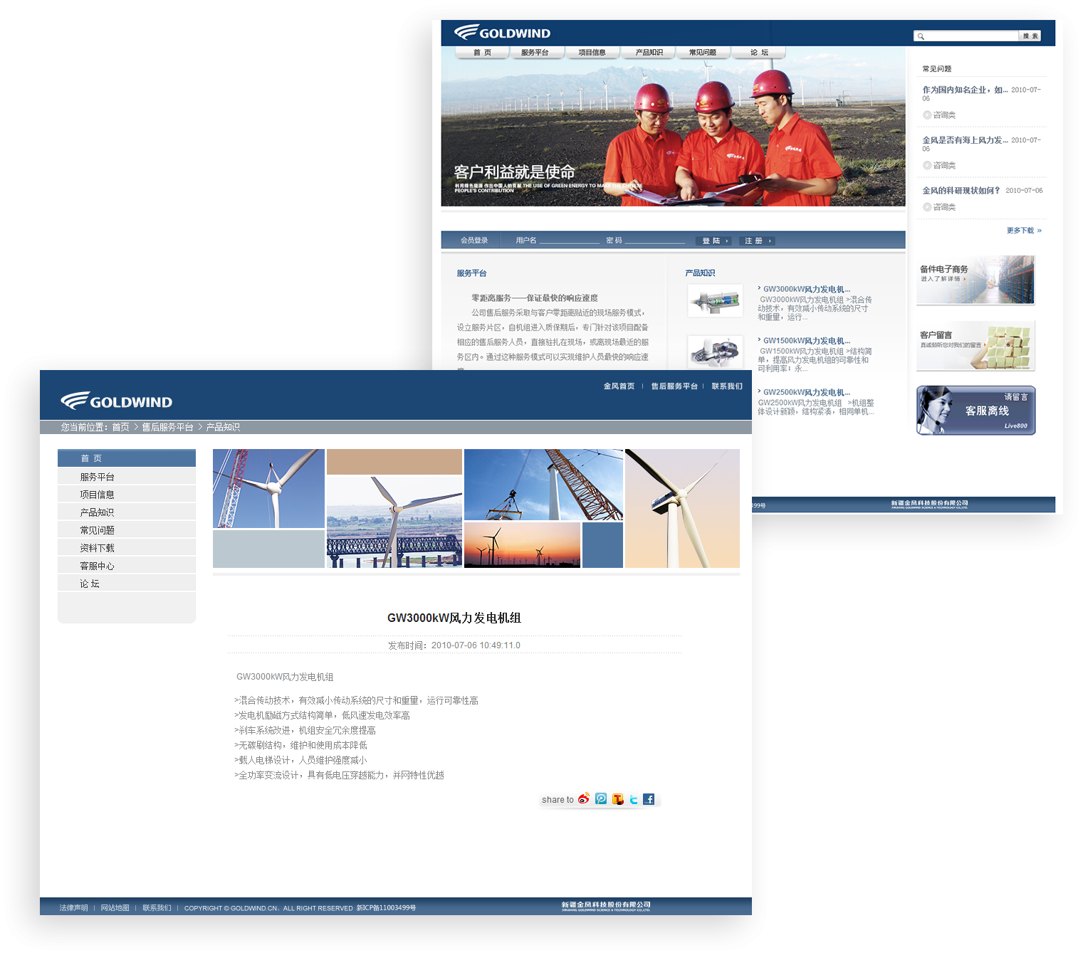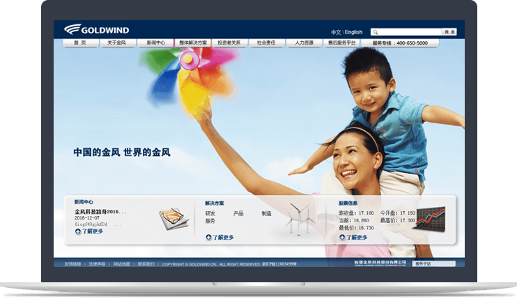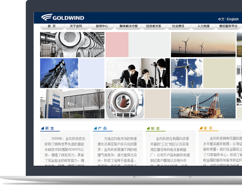 網(wǎng)站整體設(shè)計(jì)契合企業(yè)的領(lǐng)域?qū)傩裕骖櫰放婆c產(chǎn)品雙重需求,視覺(jué)效果簡(jiǎn)潔大氣,成 功塑造金風(fēng)科技創(chuàng)新、科技、國(guó)際化的品牌形象。