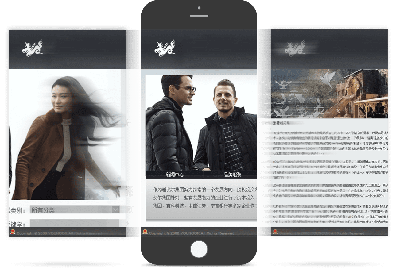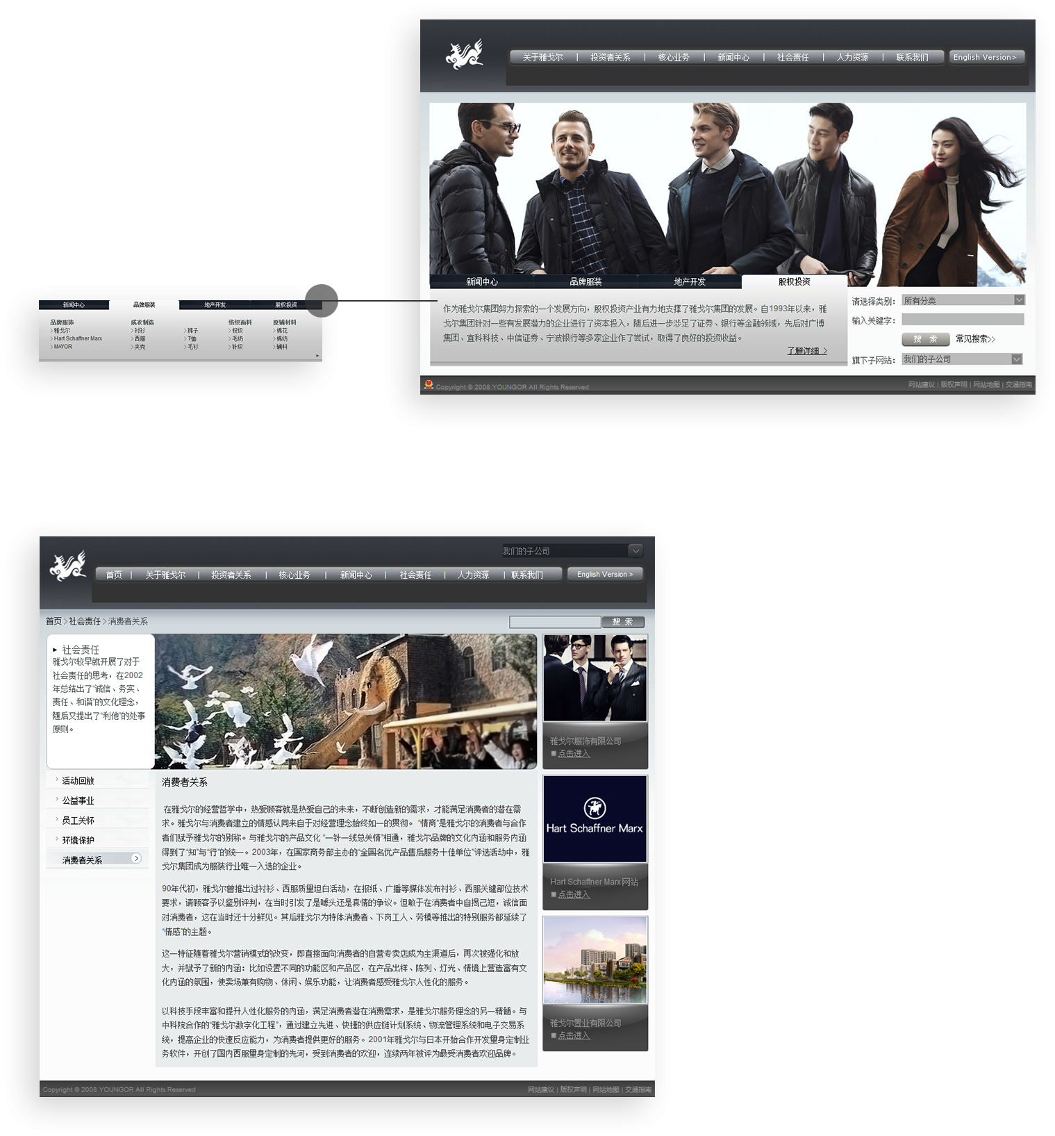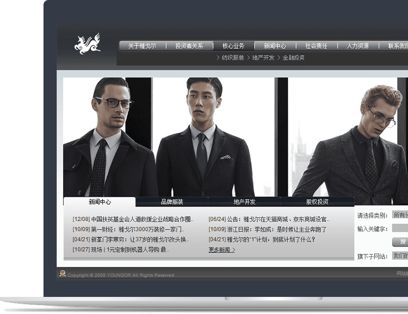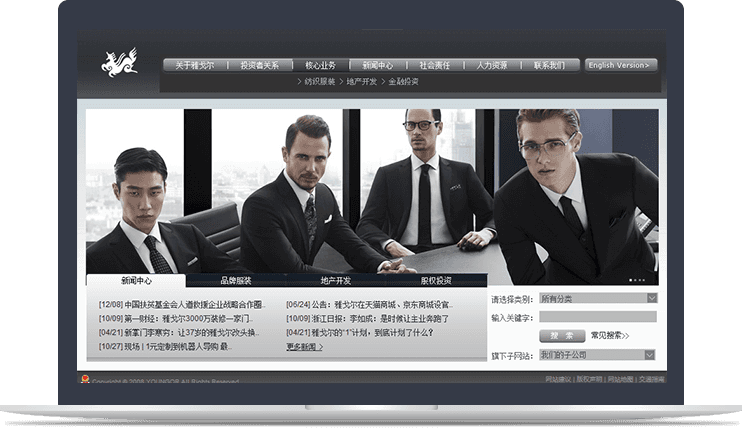 新鴻儒結(jié)合雅戈?duì)柤瘓F(tuán)的整體視覺(jué)規(guī)范,為雅戈?duì)柦ㄔO(shè)了集團(tuán)官網(wǎng)及系列旗下品牌網(wǎng)站。不僅在設(shè)計(jì)上體現(xiàn)雅戈?duì)柶放?的尊貴與穩(wěn)重的內(nèi)涵。同時(shí),技術(shù)上為其規(guī)劃了集團(tuán)網(wǎng)站群管理體系。
