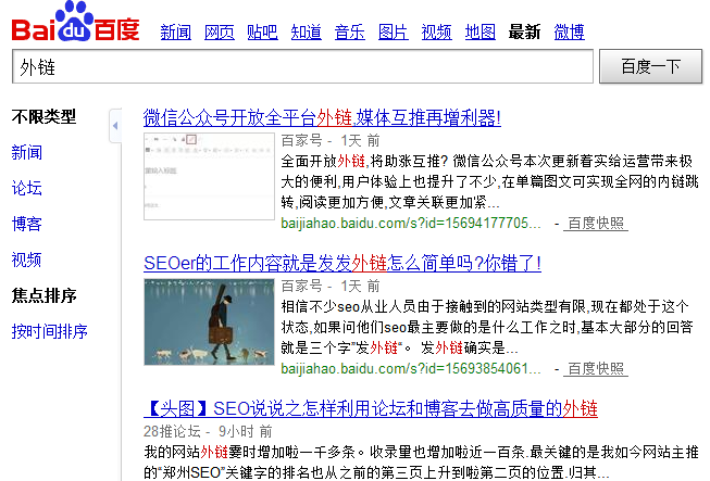 是不是就能看到很多最新“婚紗攝影”在論壇里面發(fā)布外鏈了,非常優(yōu)質(zhì)資源而且收錄很也快,高效、免費。學會使用這一招再也不用擔心找不到優(yōu)質(zhì)的外鏈資源了。
